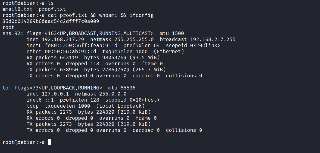Got proof.txt (85d0c014289b60aac54c2dfff7c0a009)