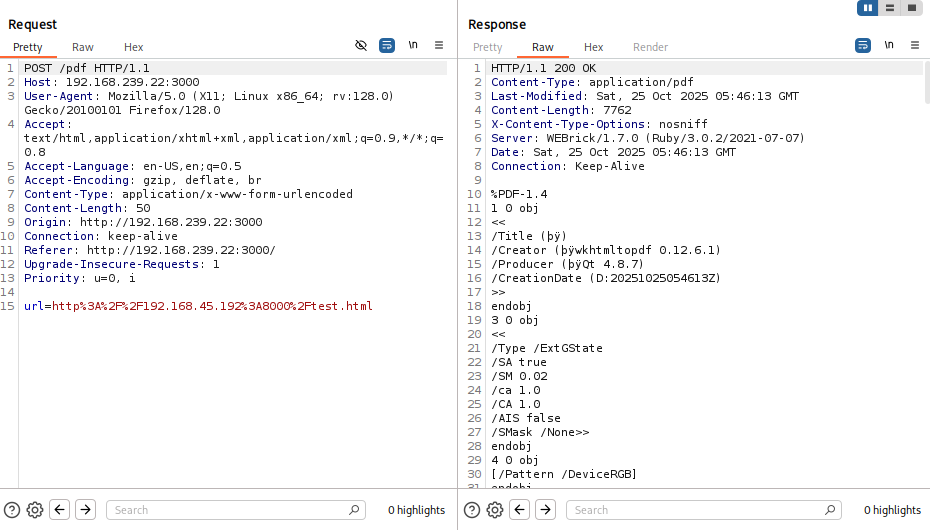 We tried parsing a test html page and it’s sending POST request to /pdf with url parameter and the we get content of html as pdf