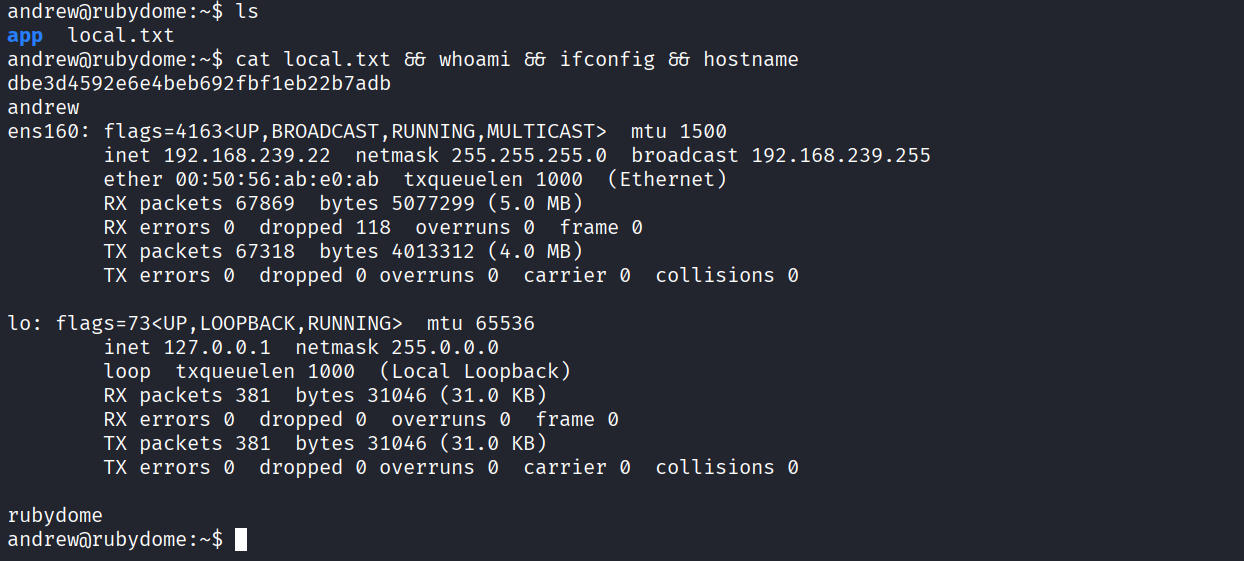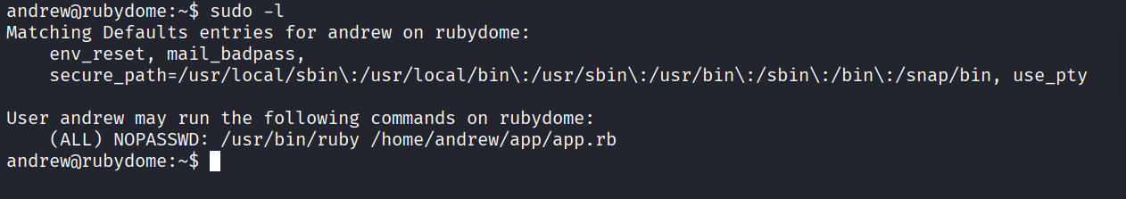 We have sudo access on /usr/bin/ruby /home/andrew/app/app.rb