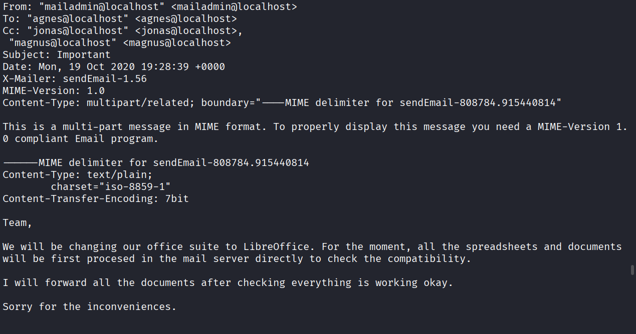 We see that jonas user has 4 messages as pop3 allows us to read mails. In mail 3 we see that mailadmin has sent a mail that they will be switching to Libreoffice