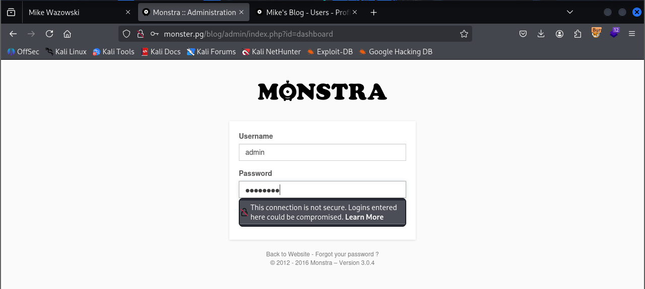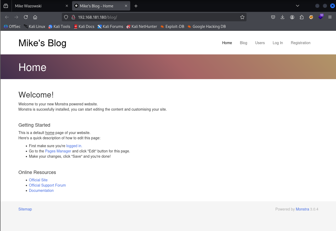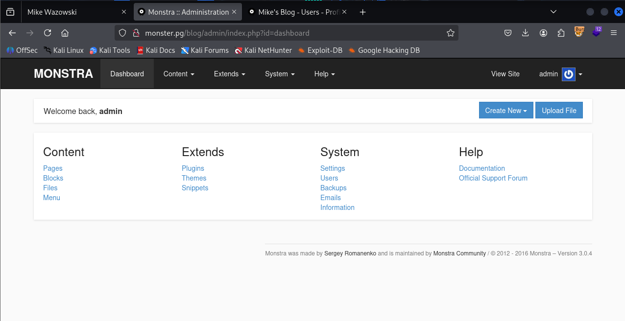 After opening we see a blog page which is running Monstra 3.0.4 which is mentioned in the footer